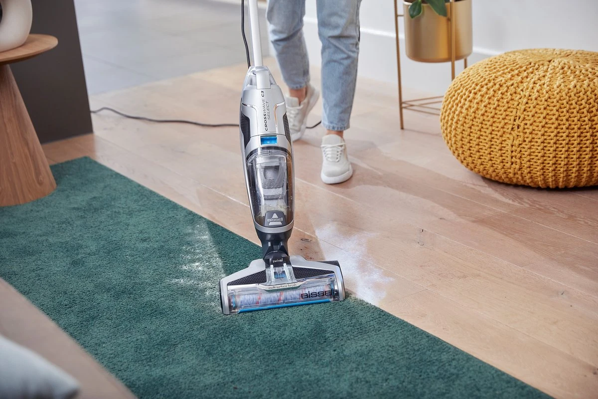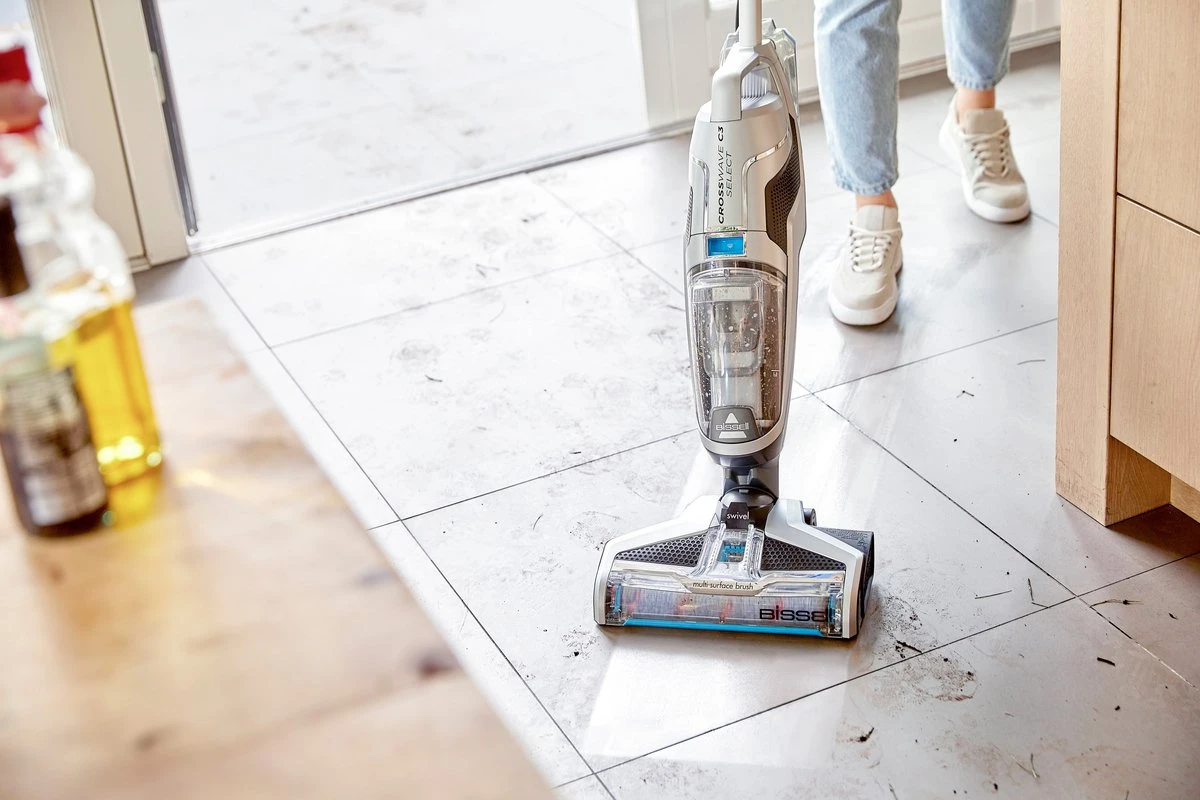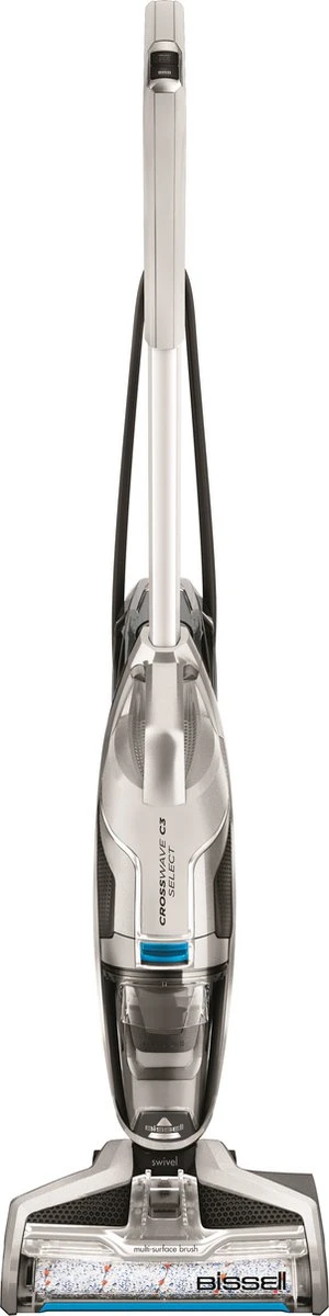 De BISSELL®CrossWave C3 Select zuigt, dweilt en droogt tegelijkertijd. Het zorgt voor een krachtige verwijdering van nat en droog vuil. Perfect voor het reinigen van verschillende soorten harde vloeren en vloerkleden. Maar ook voor kleine en grote hoeveelheden vuil op de vloer. Met de elektronische vingertopbediening kunt u direct schakelen tussen verschillende oppervlakken en zoveel water gebruiken als nodig is. Anders dan wanneer u een mop en emmer gebruikt, houdt onze dubbele reservoirtechnologie schoon en vuil water gescheiden. Met de CrossWave® C3 Select weet u dus zeker dat u uw vloer altijd met schoon water schoonmaakt.