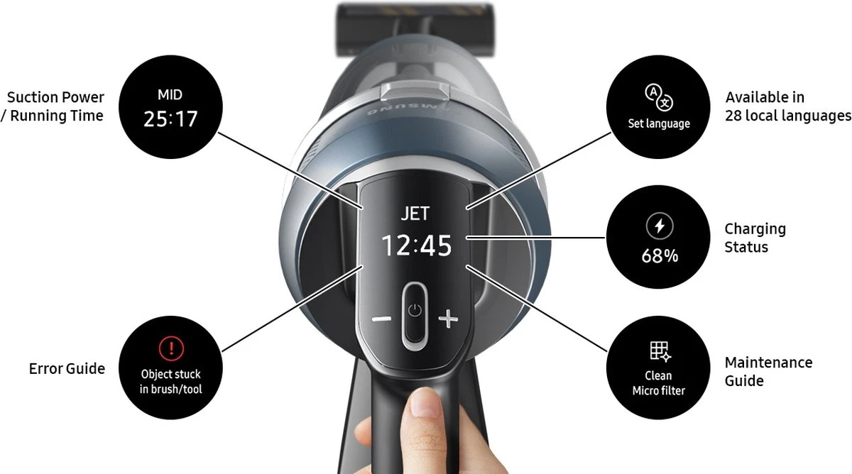Aan al het gemak is gedacht bij deze stofzuiger; hij beschikt ook over een intuรฏtief LCD digitale display. Zo zie je meteen welke stand is ingesteld en hoe lang je het apparaat nog kan gebruiken. Ook zie je in een oogopslag meldingen over een eventuele verstopping, ontbrekend filter of vastzittend object. Verder wordt tijdens het opladen op het display ook het oplaadpercentage weergegeven.