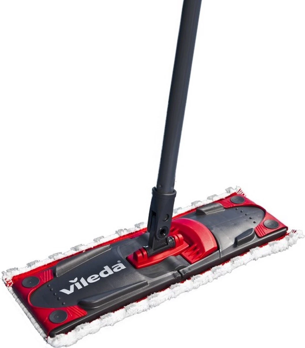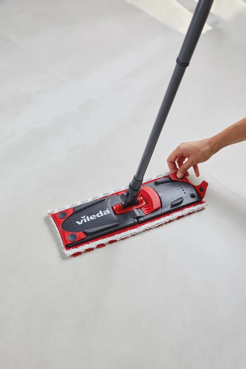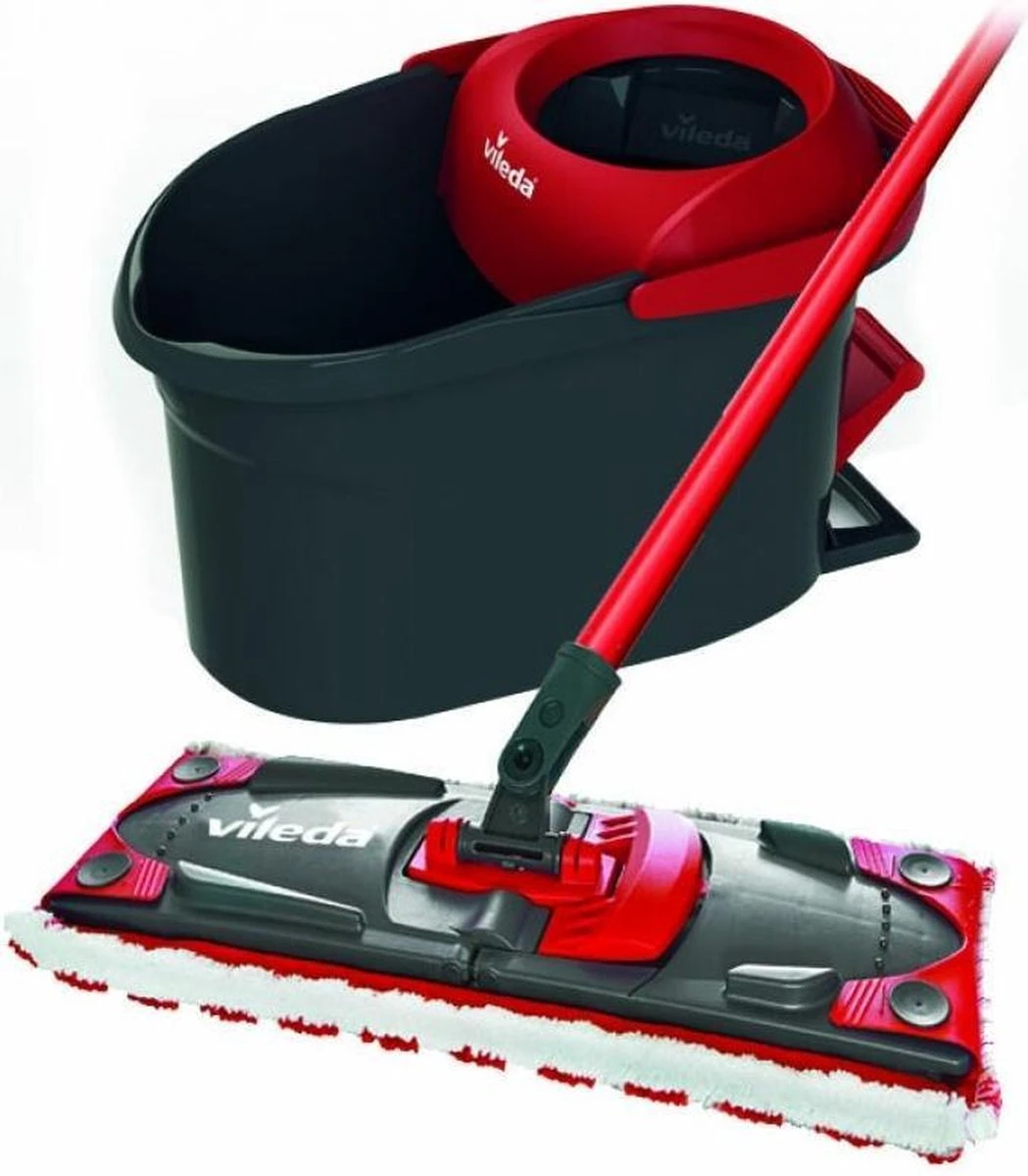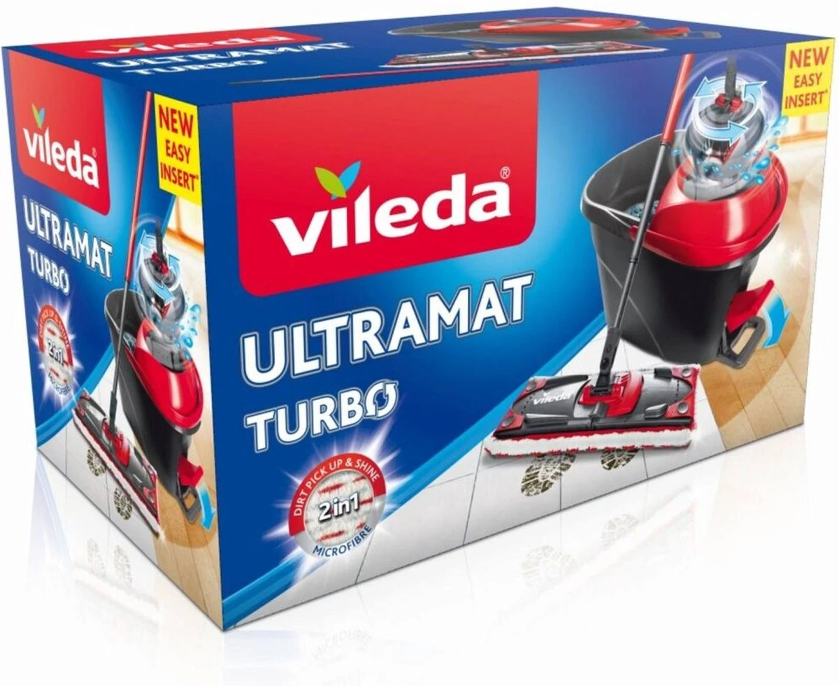 Ultramat Turbo van Vileda is een vlakke vloersysteem geleverd met een emmer met roterende pers.
