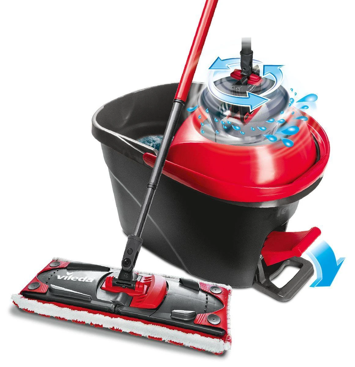 Je duwt op de pedaal en activeert hiermee het roterend uitwringsysteem, geen natte handen of rug pijn meer!